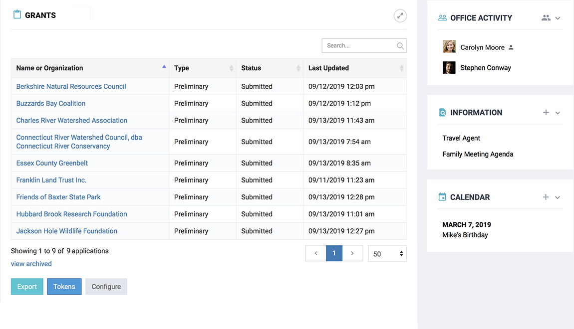 Facilitate the collection, review, and processing of 501 (c) grants and other awards. Applicants fill in fully customizable forms and upload files attached to their applications. The system tracks and notifies progress.